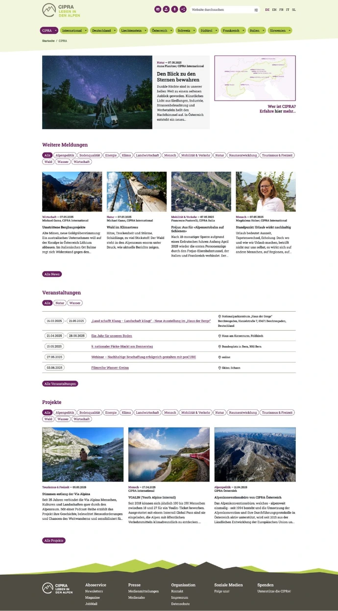 Frische Gestaltung gepaart mit neuen Funktionalitäten gibts jetzt beim CIPRA Alpenportal. Realisierung mittels PLONE Open-Source-CMS in 5 Sprachen.